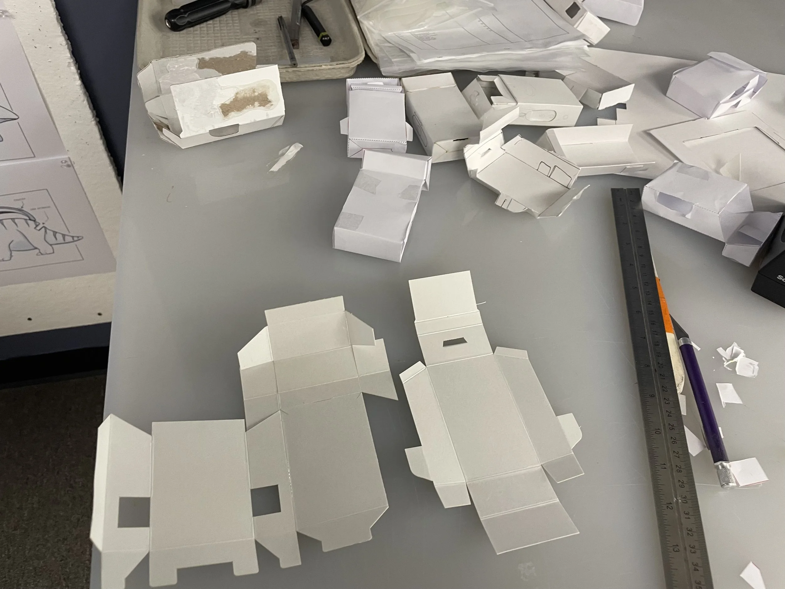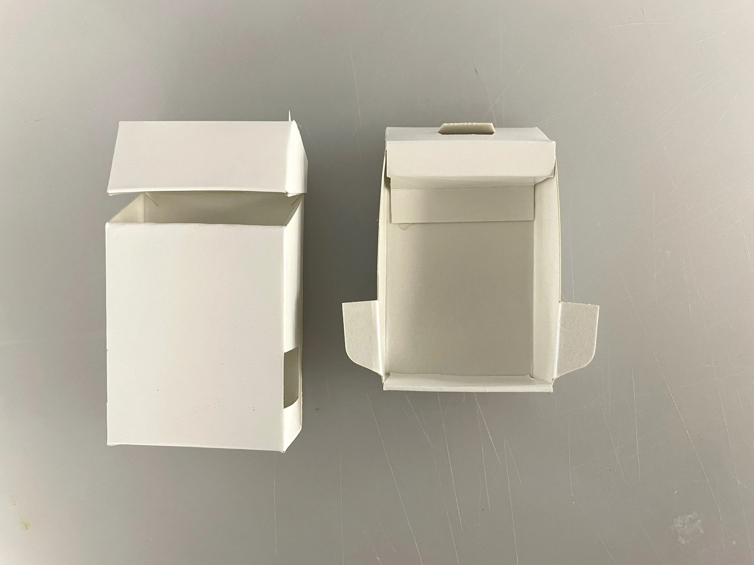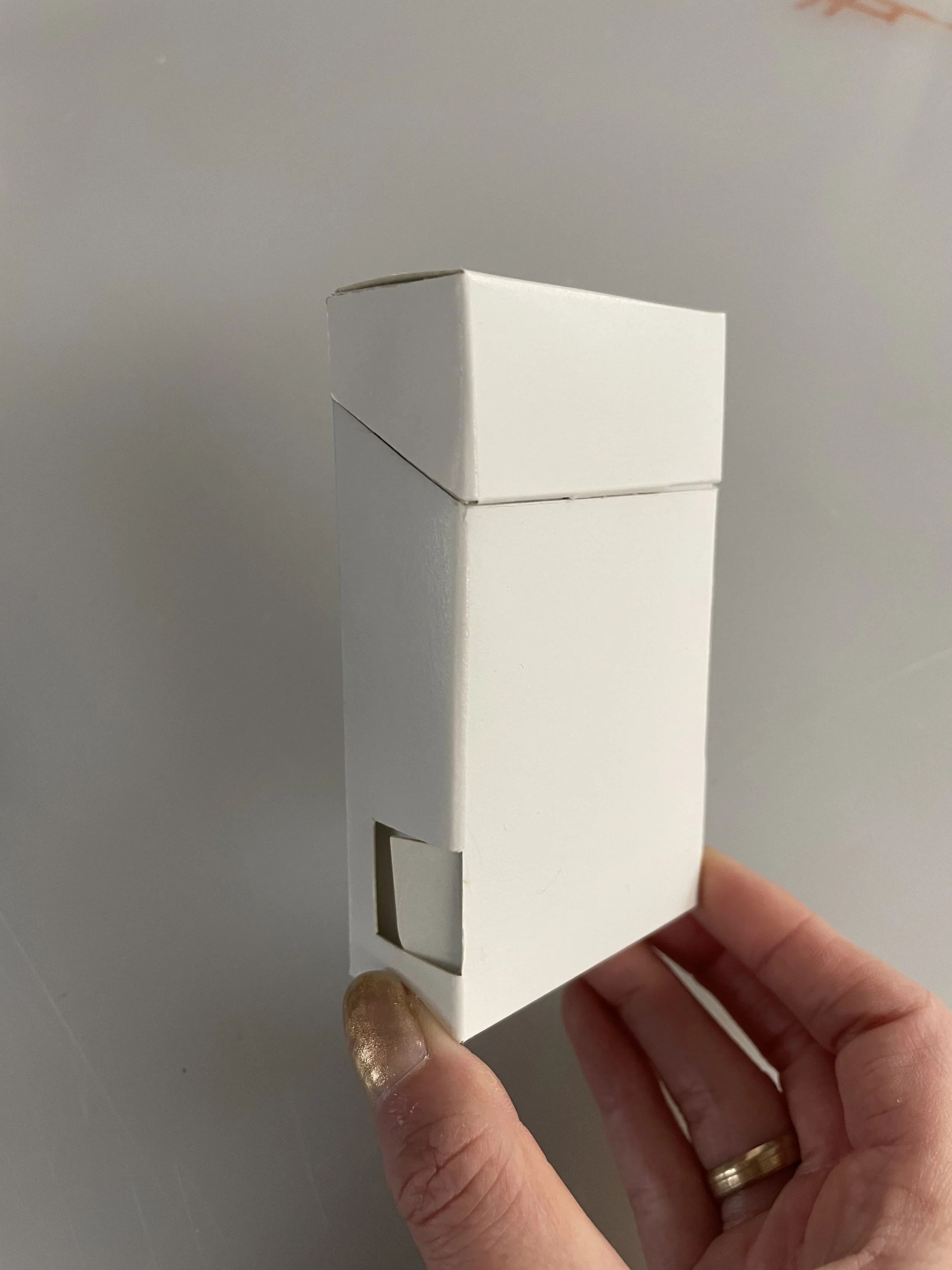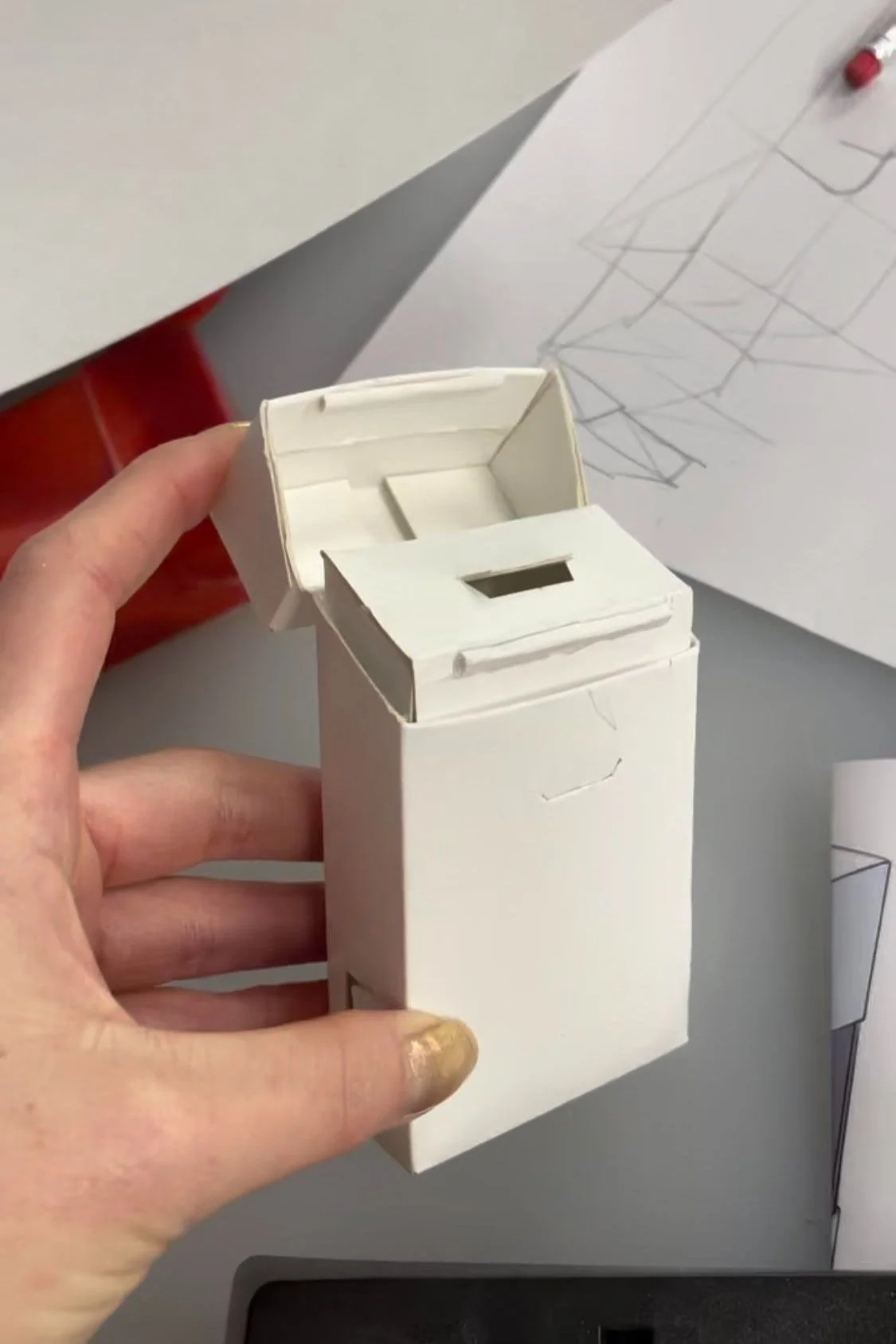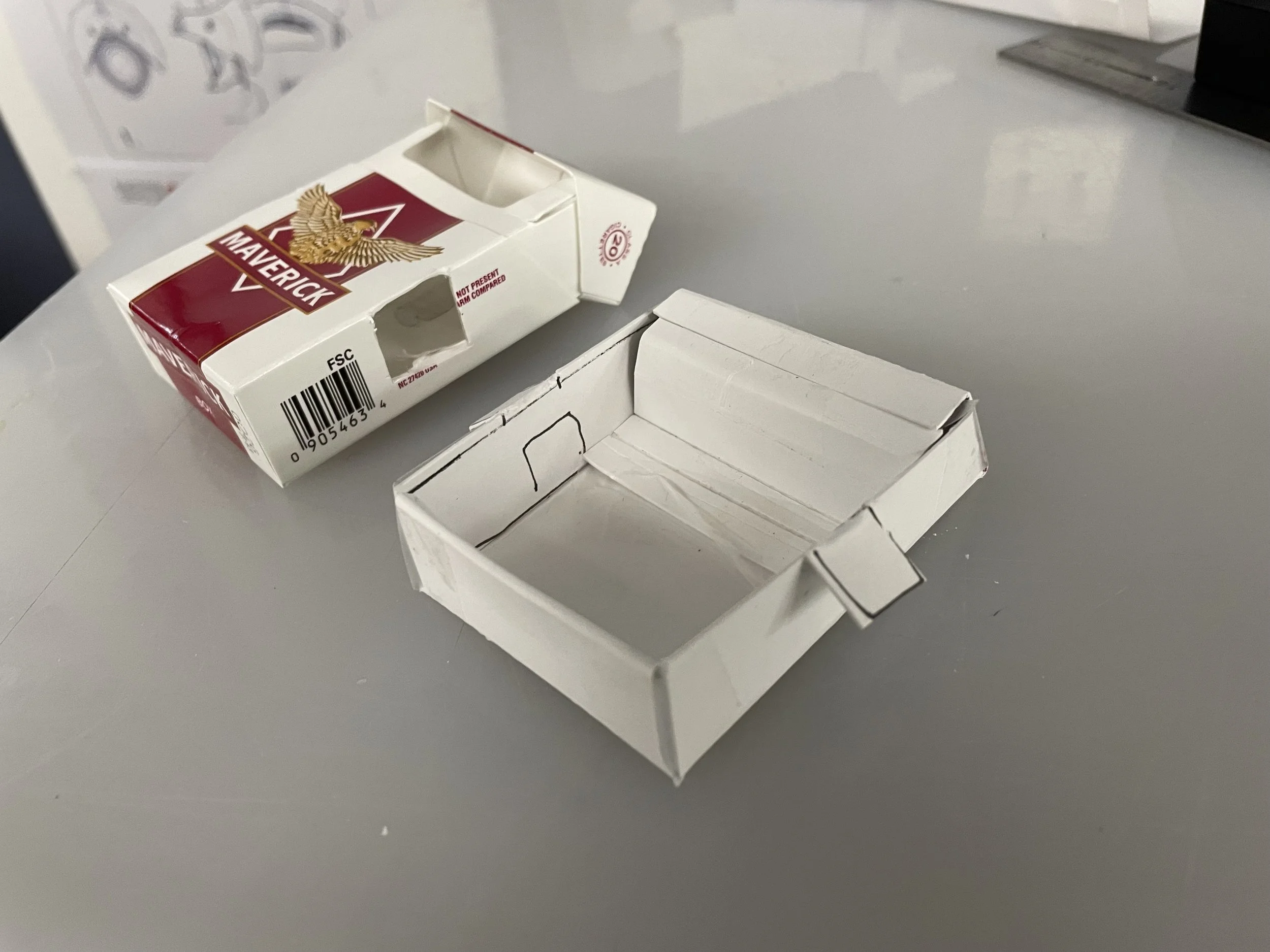 I began by dissecting and adding materials onto similar existing products like this cigarette box. It took a lot of chopping, sketching and figuring out dielines before being able to cut out tests on a laser cutter. A few concepts were tested but I finally found a design worth exploring deeper, which included an inner box that slides out. This box had to be pressed on both edges while being pulled up, solving the ‘two-action’ problem. Getting the tolerances correct took a few tries, especially while choosing a material thickness that worked best, but the final idea of the two piece slide-out box was born and perfected.